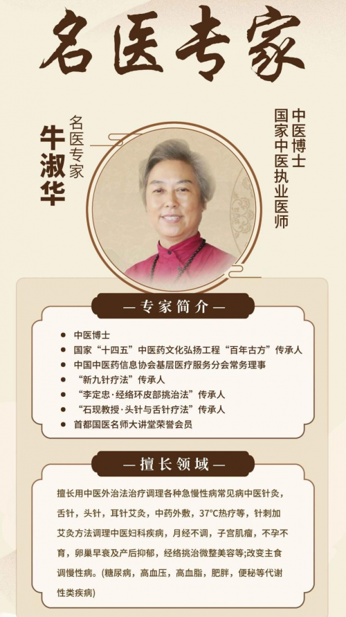 牛淑华,北京同仁堂济宁中医院副主任医师,中医博士,中医执业医师,高级健康管理师,国家二级公共营养师,健康营养讲师,北京生命科学院理事。 少时便参加了由解放军在济宁市组织的《新医疗法》,学习新针疗法穴位注射,封闭,割治,羊肠线埋藏等疗法并实习于济宁市中医研究所,后被破格纳入沛县中医院针灸科医生,拜师程莘农院士,石学敏院士,于书庄老师学习针灸,毕业于针灸专科进修学院,在北京跟多名国医大师学习中医(刘文龙教授),针灸(金伯华教授)吴中朝中药外敷(田丛豁教授)朱允龙(整骨推拿)董福慧铍针等学习并拜师经络大师李定忠教授并获得了李老的经络环皮挑治法传承证书,并拜师三0一医院针灸主任石现为师,荣获石现教授头针与舌针疗法荣誉传承证书。 擅长用中医外治法治疗调理各种急慢性病常见病中医针灸,舌针,头针,耳针,艾灸,眼针,中药外敷,37℃热疗等,针刺加艾灸方法调理中医妇科疾病,月经不调,子宫肌瘤,不孕不育,卵巢早衰及产后抑郁,经络挑治微整美容,青少年近视,儿童长高,偏食厌食,矮小等:改变主食调慢性病(糖尿病,高血压,高血脂,肥胖,便秘等代谢性类疾病)。