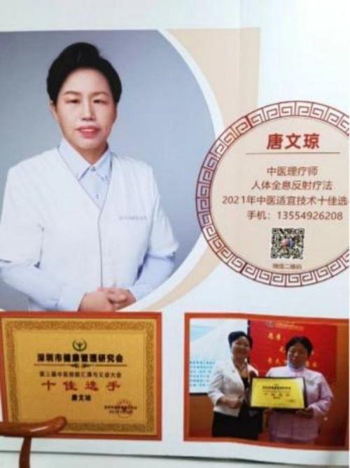 在唐文琼的带领下,努力将中医养生智慧与现代科技力量编织成一幅宏大而又细腻的生命守护图景。她也由此获得了国际政商新春联谊会颁发的中医传承人称号、中医药传承创新分会特聘为“中国国际科技促进会中医药传承创新分会特约研究员”、深圳市健康管理研究会第三届中医技能汇演与义诊大会十佳选手、《当代科学家》杂志封面人物,其发明创造的唐氏筋膜全息疗法也被中关村健康服务产促进会评定为健康优势技术(产品),并被大健康产业高质量发展大会详细报道等。