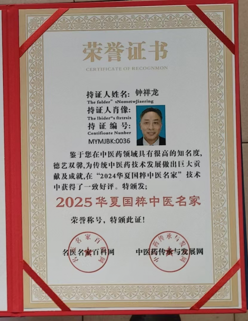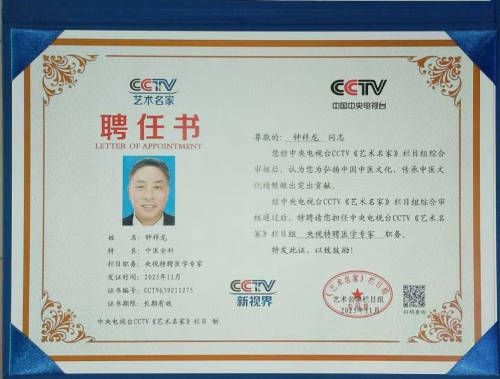 2025年11月,中央电视台授予钟祥龙医生央视特聘医学专家,国学名师传承工作室