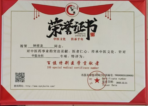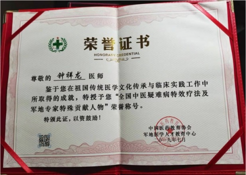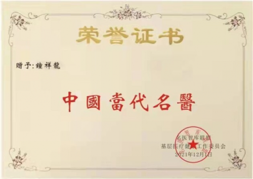 钟祥龙老师从医四十多年的中医临床工作,总结出了丰富的常见病和疑难病治疗经验,并撰写医学论文20余篇。事迹入编《中华中医薪火传承录》首卷并担任副主编;个人传略入录《中国中医名术大典》和《中国医药人才名录》并担任编委;2019年6月入编健康中国第二卷《大医精诚》典籍。