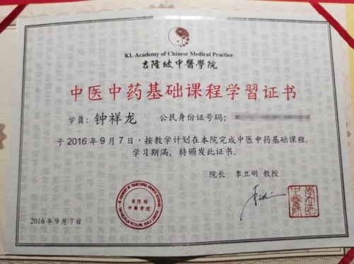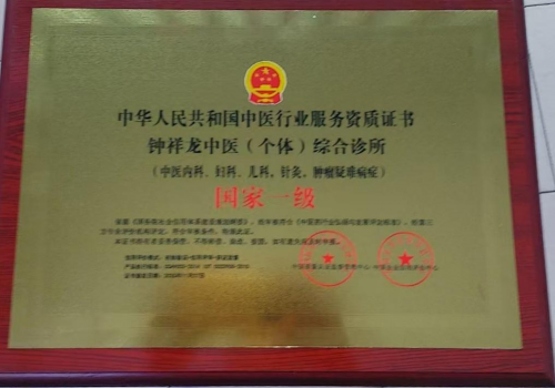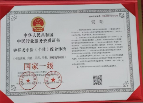 中华人民共和国中医行业服务资质证书,为钟祥龙颁发中医个体综合诊所,国家一级。