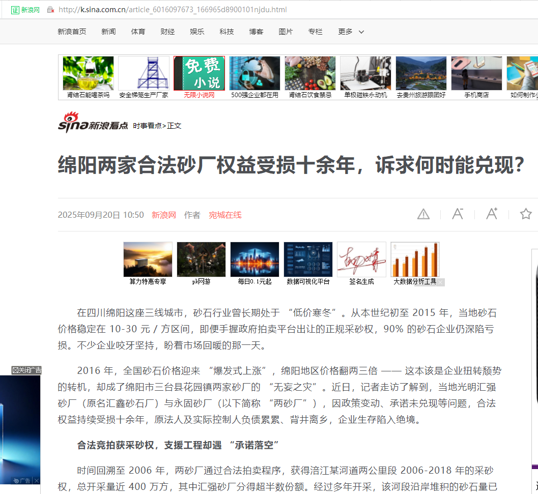 在四川绵阳这座三线城市,砂石行业曾长期处于 “低价寒冬”。从本世纪初至 2015 年,当地砂石价格稳定在 10-30 元 / 方区间,即便手握政府拍卖平台出让的正规采砂权,90% 的砂石企业仍深陷亏损。不少企业咬牙坚持,盼着市场回暖的那一天。 2016 年,全国砂石价格迎来 “爆发式上涨”,绵阳地区价格翻两三倍 —— 这本该是企业扭转颓势的转机,却成了绵阳市三台县花园镇两家砂厂的 “无妄之灾”。近日,记者走访了解到,当地光明汇强砂厂(原名汇鑫砂石厂)与永固砂厂(以下简称 “两砂厂”),因政策变动、承诺未兑现等问题,合法权益持续受损十余年,原法人及实际控制人负债累累、背井离乡,企业生存陷入绝境。 合法竞拍获采砂权,支援工程却遇 “承诺落空” 时间回溯至 2006 年,两砂厂通过合法拍卖程序,获得涪江某河道两公里段 2006-2018 年的采砂权,总开采量近 400 万方,其中汇强砂厂分得超半数份额。经过多年开采,该河段沿岸堆积的砂石量已不低于 200 万方。