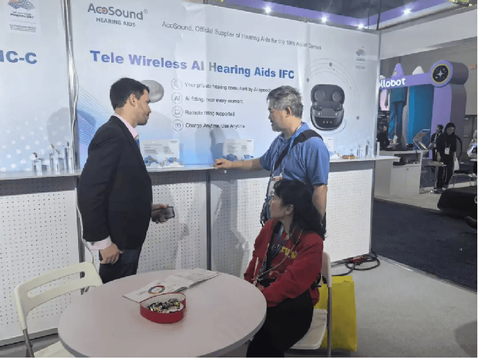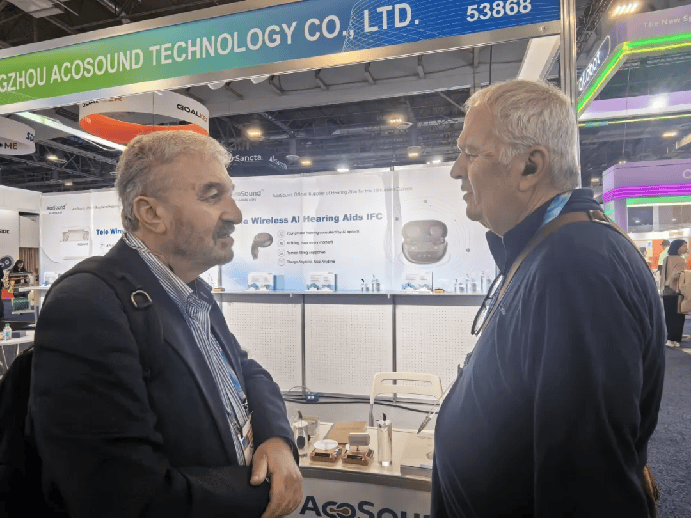 技术体验区:现场见证清晰科技 在核心技术展示区,爱可声助听器展示了其全自研的芯片,并设置了智能验配系统的实时体验环节。 1 ACOD自研芯片,收获认可 众多国际友人在现场佩戴体验后表示,在复杂的模拟声场中,语音清晰度与方向感提升显著。这背后正是爱可声自研芯片提供的超高算力与极低功耗,实现了精准的实时信号处理,获得了现场体验者的高度认可。
