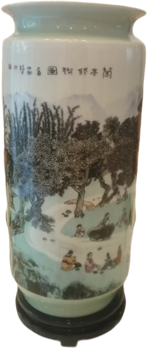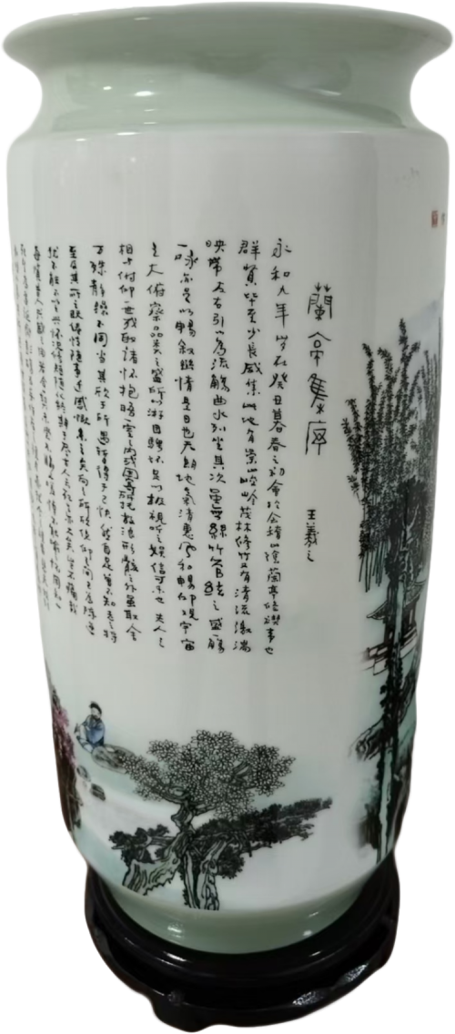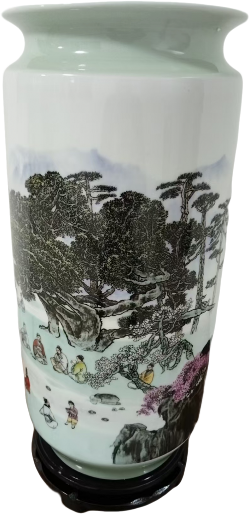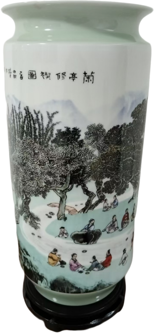 一、器以载道:瓷瓶形制与工艺之美 这件《兰亭修褉图》瓷瓶采用经典的筒形瓶(灯笼瓶)形制,器形端庄典雅,线条流畅圆润,既保留了传统瓷瓶的稳重感,又不失灵动之气。瓶高约 40 厘米,口径适中,瓶身微微收腰,底部承以墨色木座,整体比例协调,视觉上给人以 “亭亭玉立” 之感,完美契合了文人雅士追求的 “中和之美”。 从工艺上看,这件瓷瓶是景德镇釉上重工粉彩的典范之作,凝聚了王锡良近一个世纪的陶瓷技艺。它以高白泥为胎,经 1300℃高温素烧成型,胎质细腻坚致,透光性极佳,为后续的粉彩绘制奠定了坚实基础。瓶身施一层温润的白釉,釉色匀净透亮,如羊脂美玉般细腻,既衬托出画面的清雅,又让整个器物散发着含蓄内敛的光泽。